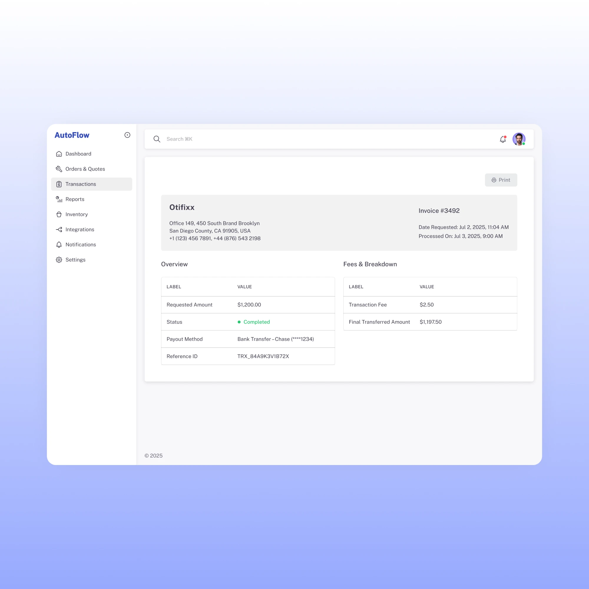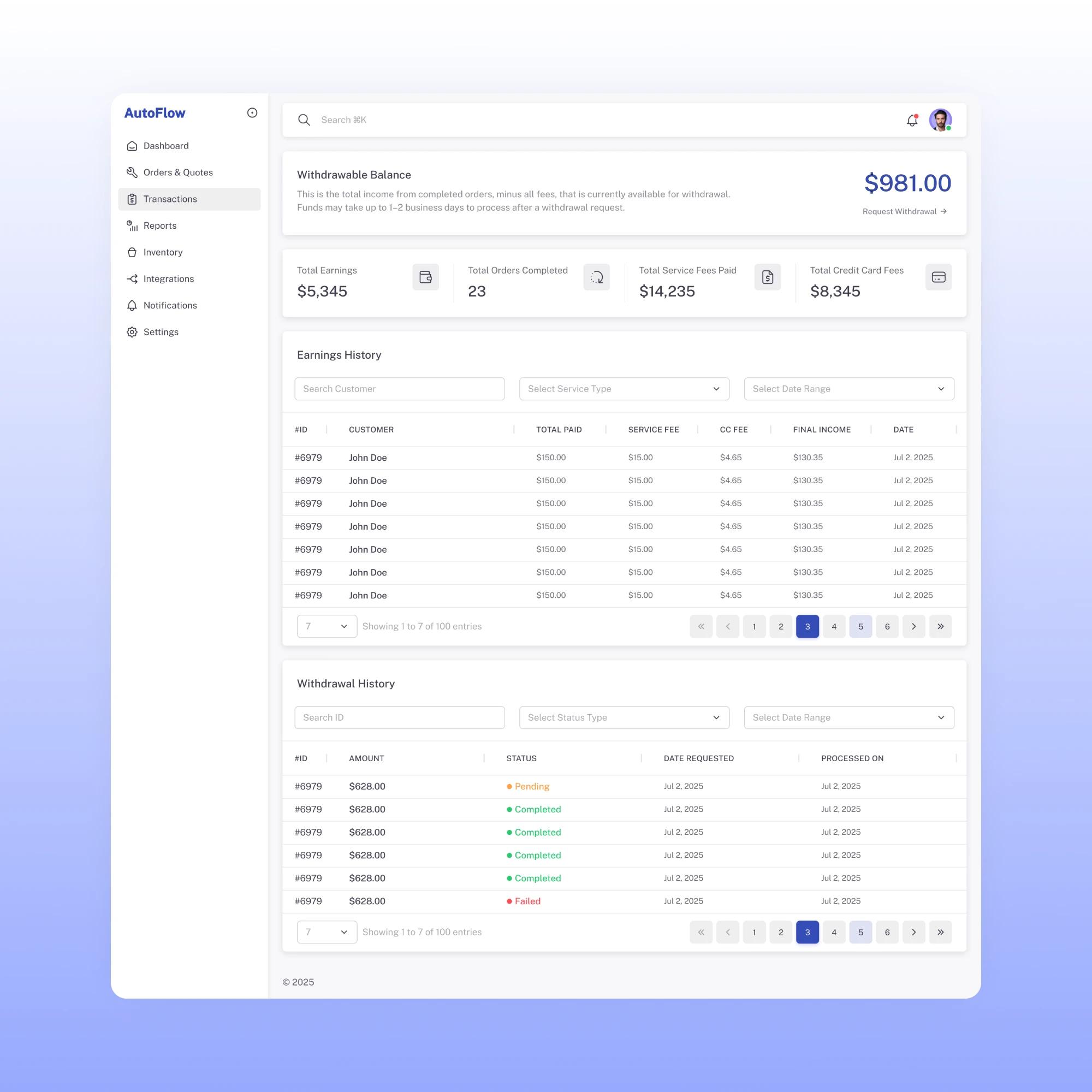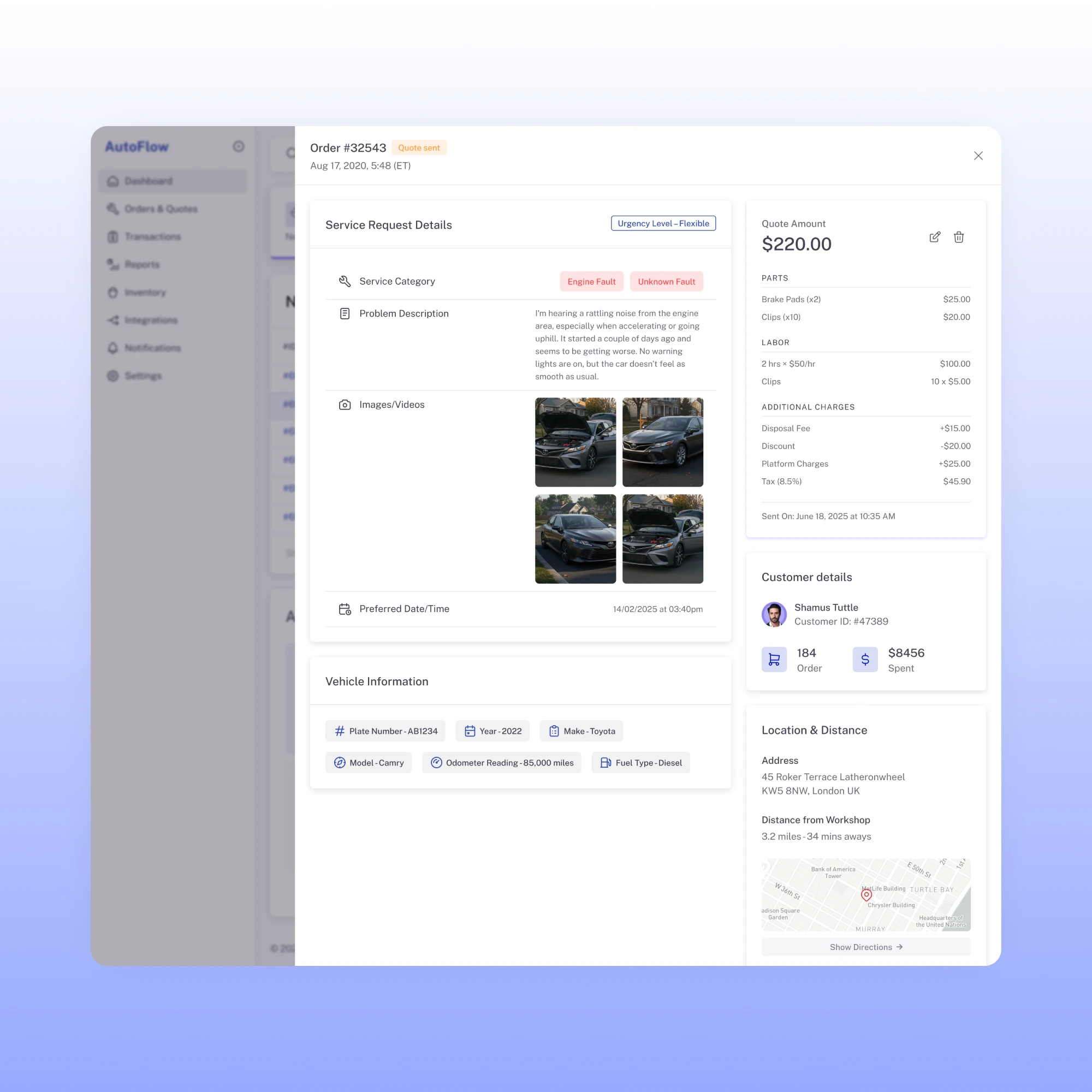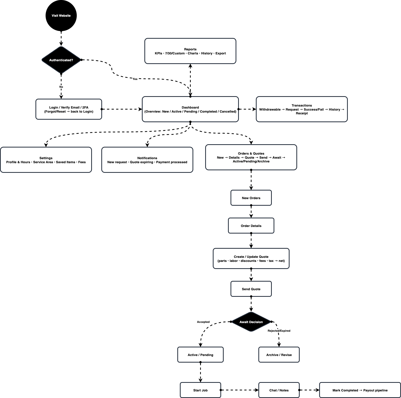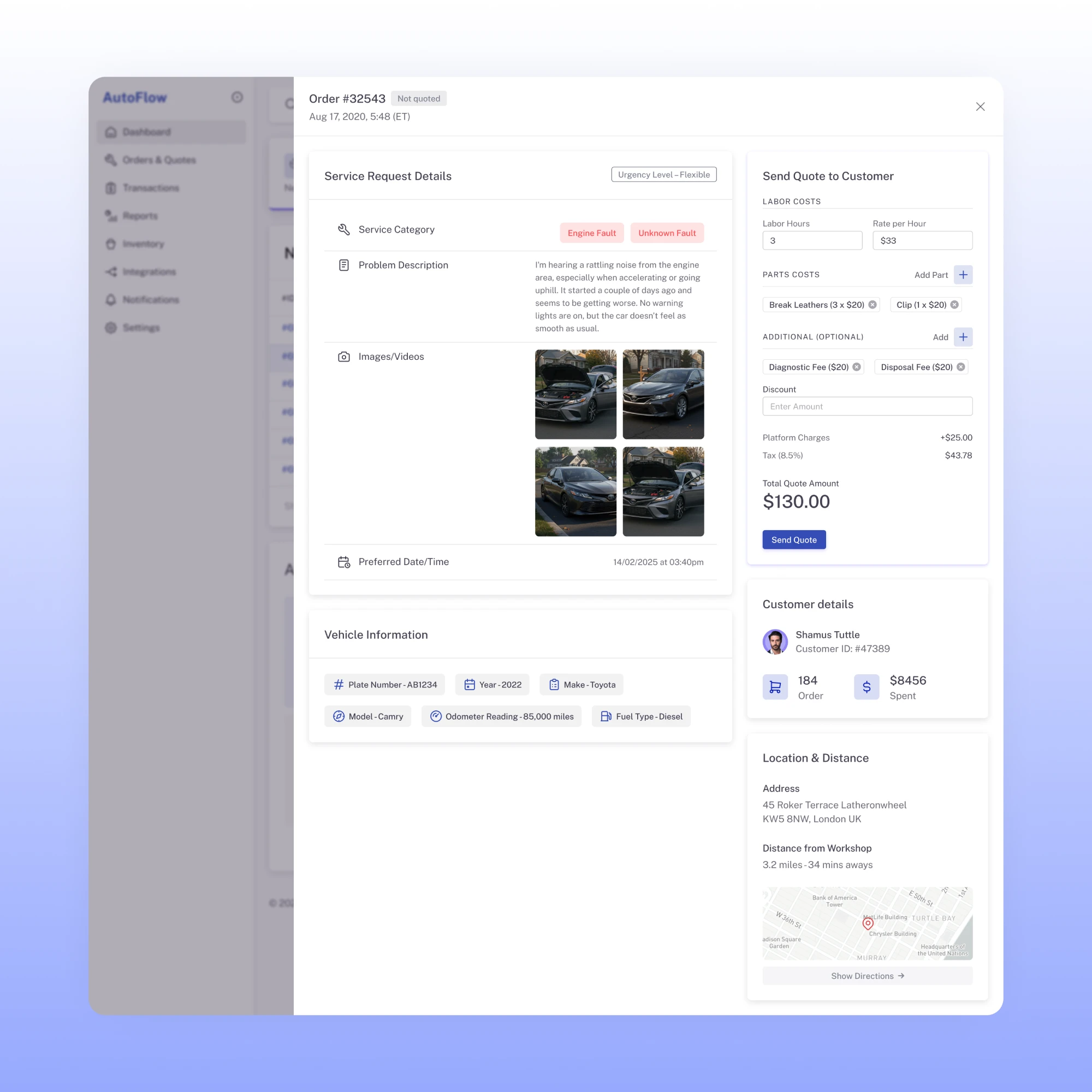 The finalized design delivered an intuitive, powerful dashboard enabling shop owners to manage repair jobs effortlessly, track income transparently, and communicate efficiently with customers. Key workflows like order management, quote submission, transaction handling, and detailed reporting were refined through user testing, resulting in enhanced productivity, reduced response times, and greater financial clarity.